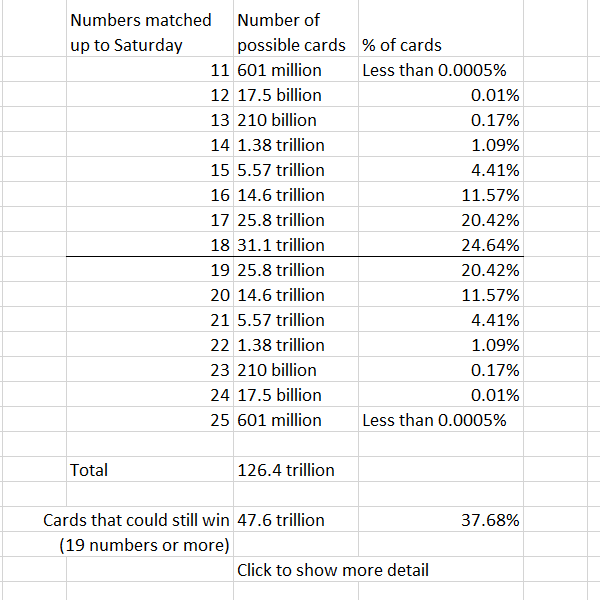 You’ve played all week and marked your numbers off every day – so how likely is it that you’ll still be a contender as Sunday approaches? To have any chance of winning in the remaining 6 calls you must have marked off at least 19 numbers, but it is possible, after 6 days, to have marked off as few as 11 numbers (with all 14 numbers not yet called appearing on your card). A card with anything from 11 to 18 numbers marked off and one day left is no longer capable of winning – so how many of those cards are there? Again, this is a nice symmetrical distribution with the number of cards in the extreme case of 11 calls equal to the number of cards in the other extreme case of having won already with 25 calls, and to work out the numbers in the middle we must multiply by the number of possible combinations of numbers that haven’t yet been called.