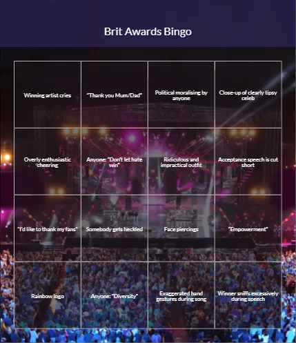 What this all means of course is that the Brit Awards are absolutely ideal for a watch party with our Brit Awards bingo cards as a centre-piece. But how do you play?