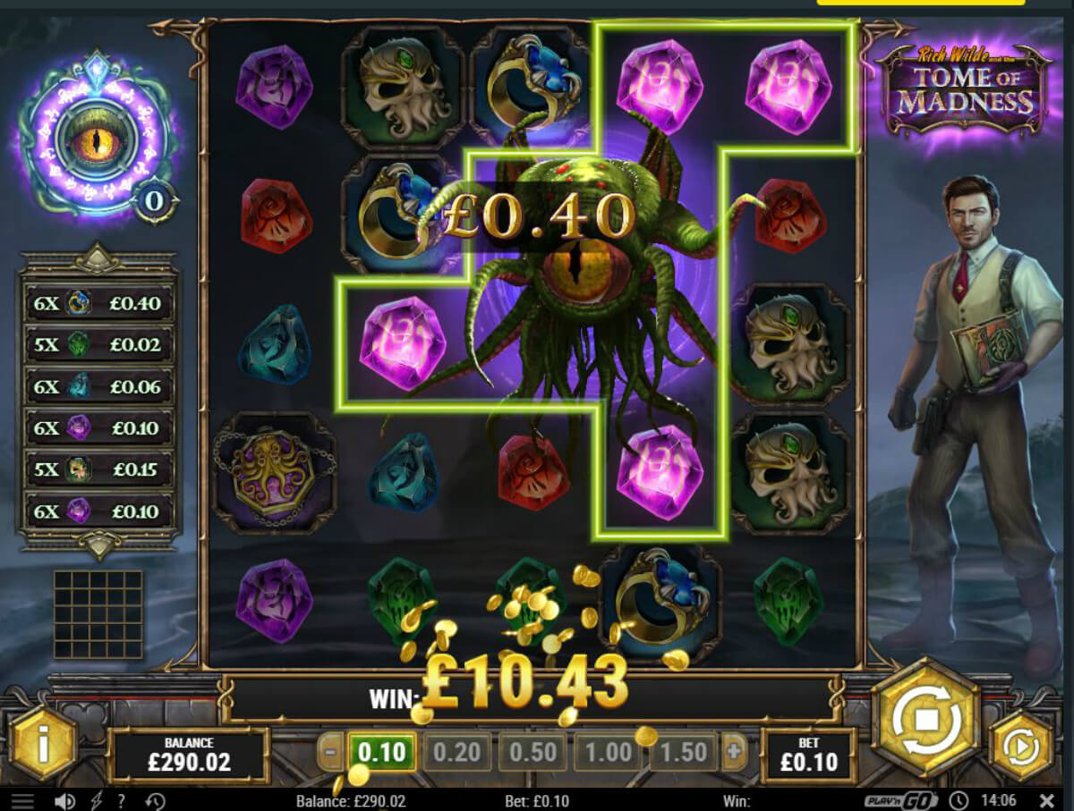 Rich Wilde and the Tome of Madness is played on a 5×5 grid and has no paylines as such. Instead, wins are awarded for groups of 4 or more matching symbols touching horizontally or vertically. Winning groups explode, the rest of the symbols drop down into the gaps and new symbols drop in from the top of the screen; the cascade continues until there are no more wins.